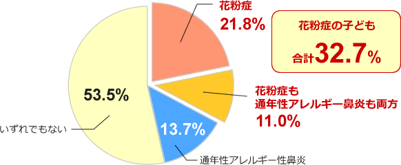また「父親のみが花粉症の子ども」は23.4%が花粉症を発症していますが、「母親のみが花粉症の子ども」は、32.8%が花粉症という調査結果が浮かび上がってきました。