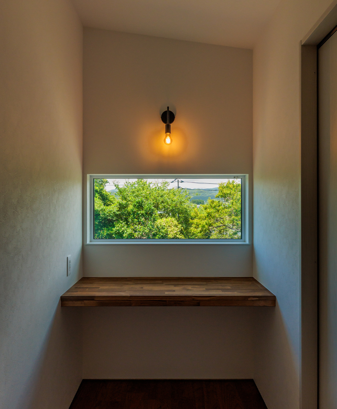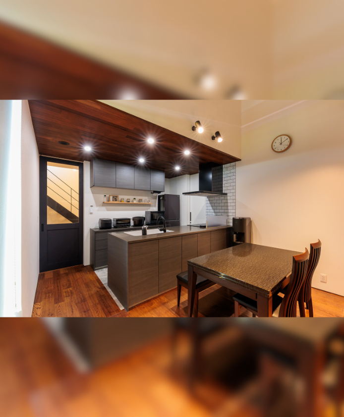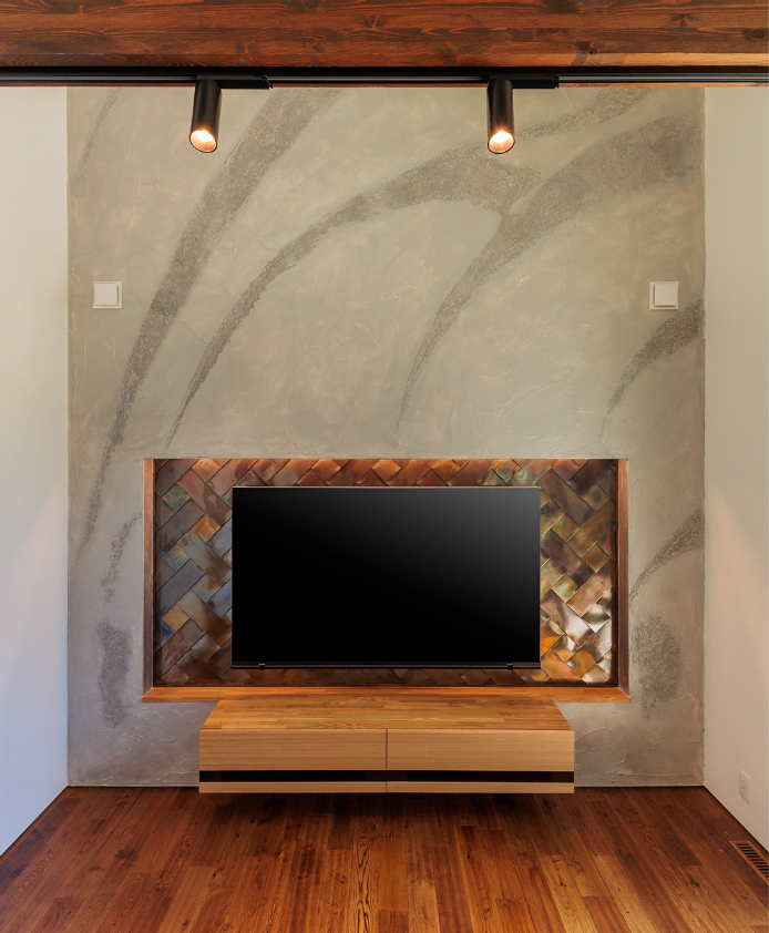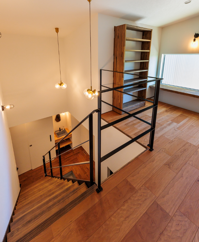 大きなガレージと趣味室を行き来できる動線と、勾配天井の開放的なLDKの一角にはご主人様お手製の鋼板で織りなすオリジナル壁が魅力的な住まい。